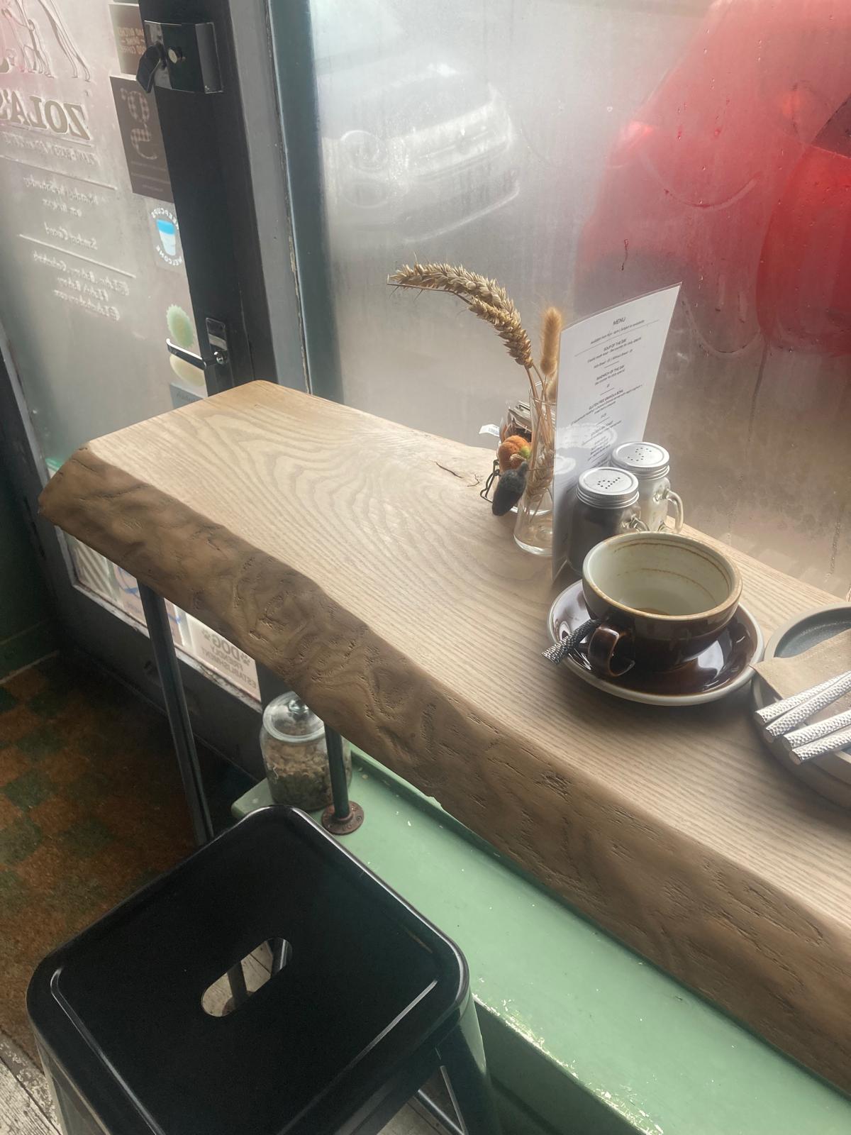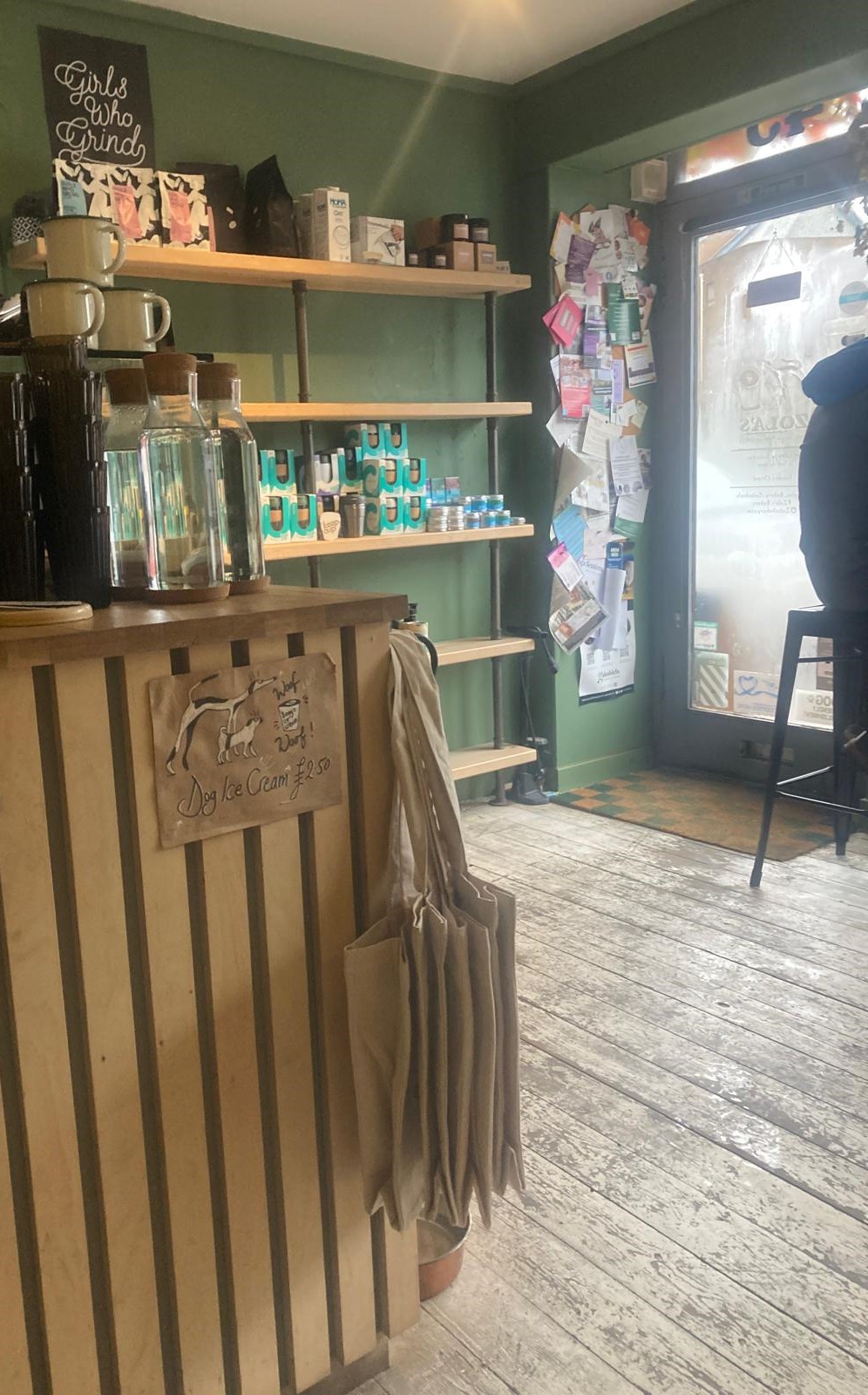 Zola’s a small well-dressed space with taste, not pretention. That window plank is artfully varnished and sanded and a pleasure to sit at, with similar shelves exhibiting a modest range of coffee kit held up by bits of pipe. The beans are from Girls Who Grind. Indeed. Infact, surreptitiously studying the ‘Girl Crush’ blend in the hopper I see that the staff really like ‘Girls & Coffee & Fuck the Patriarchy’. Amen to that. Not only do they do humour in Zola’s but they have style and love too. There is a wall-of-Customers-Dogs polaroid montage and ice cream, vegan ice cream, available for woman’s best friend. Everyone and their dog are welcome here.