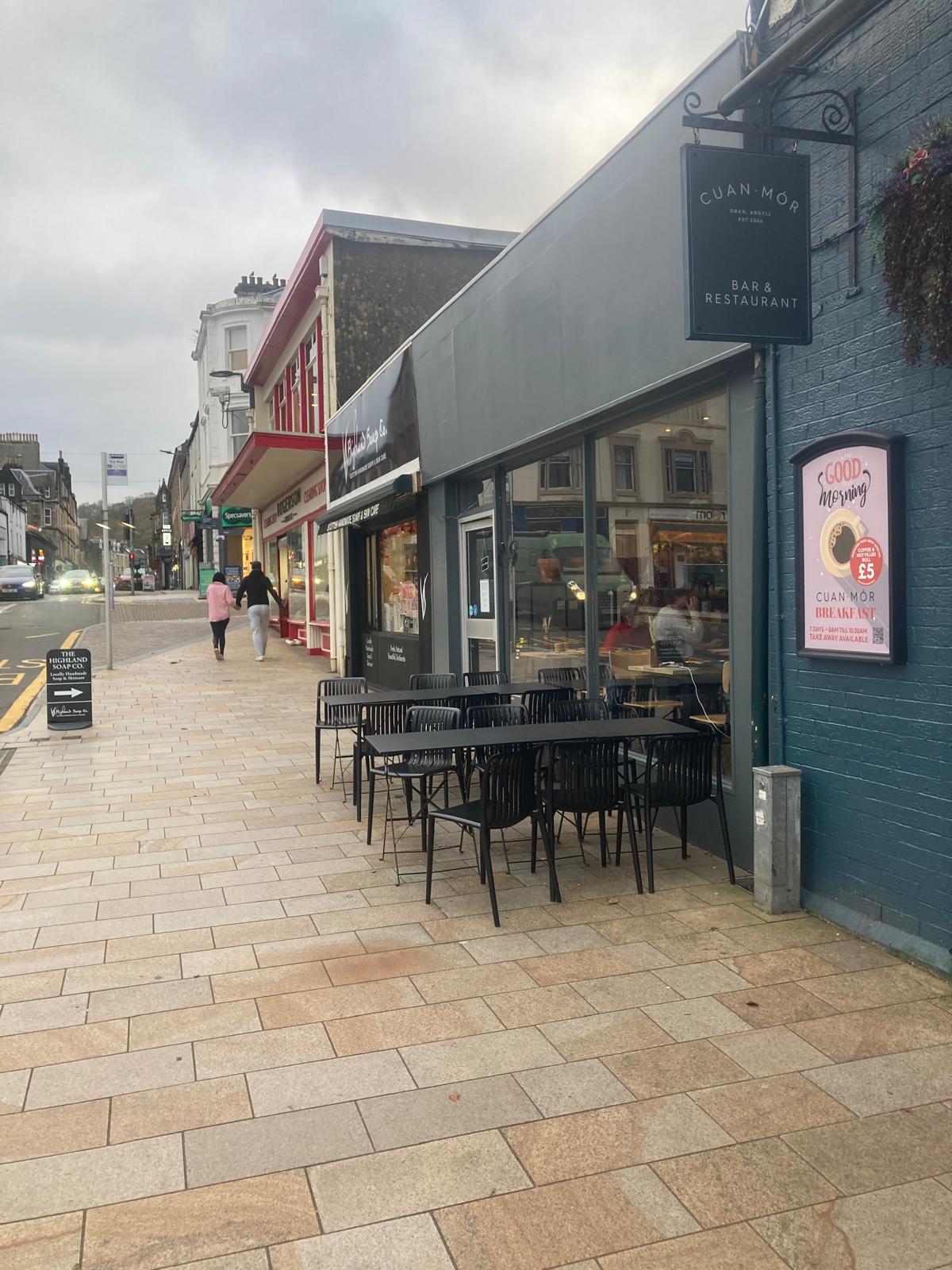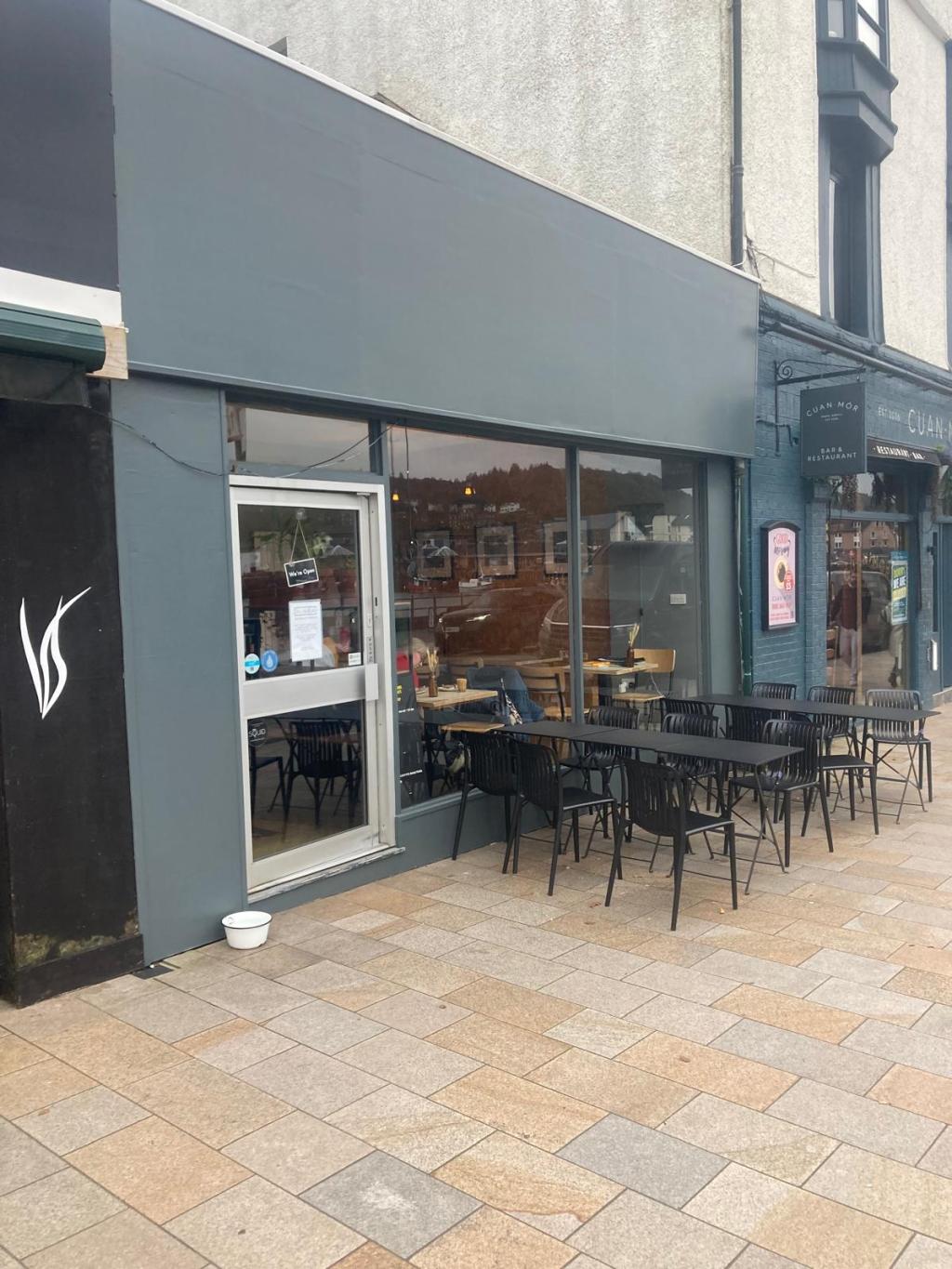 This is a wild west outpost of the Hinba Partick/West End organisation. I’ve been here before as I thought it was the only coffee game in town. Inside it’s ‘mild trendy coffee shop’. Choice of 3 beans as standard, card only because cash is so dated, laminate floor, downlighters, tasteful House playing with the bass removed, some nice art, a pitiless laminated plywood bench coupled with a new monstrosity: a tall, varnished particleboard panel designed to elicit a quick false confession from the sitter. The tables are not for lounging. It’s a reasonable conversion of the space, light and clean. A typical Glasgow/Edinburgh place but atypical plonked down in Oban. There is a good view of the Esplanade and harbour *weather dependant* and tables outside *passing juggernaut and filming tourist dependant*.