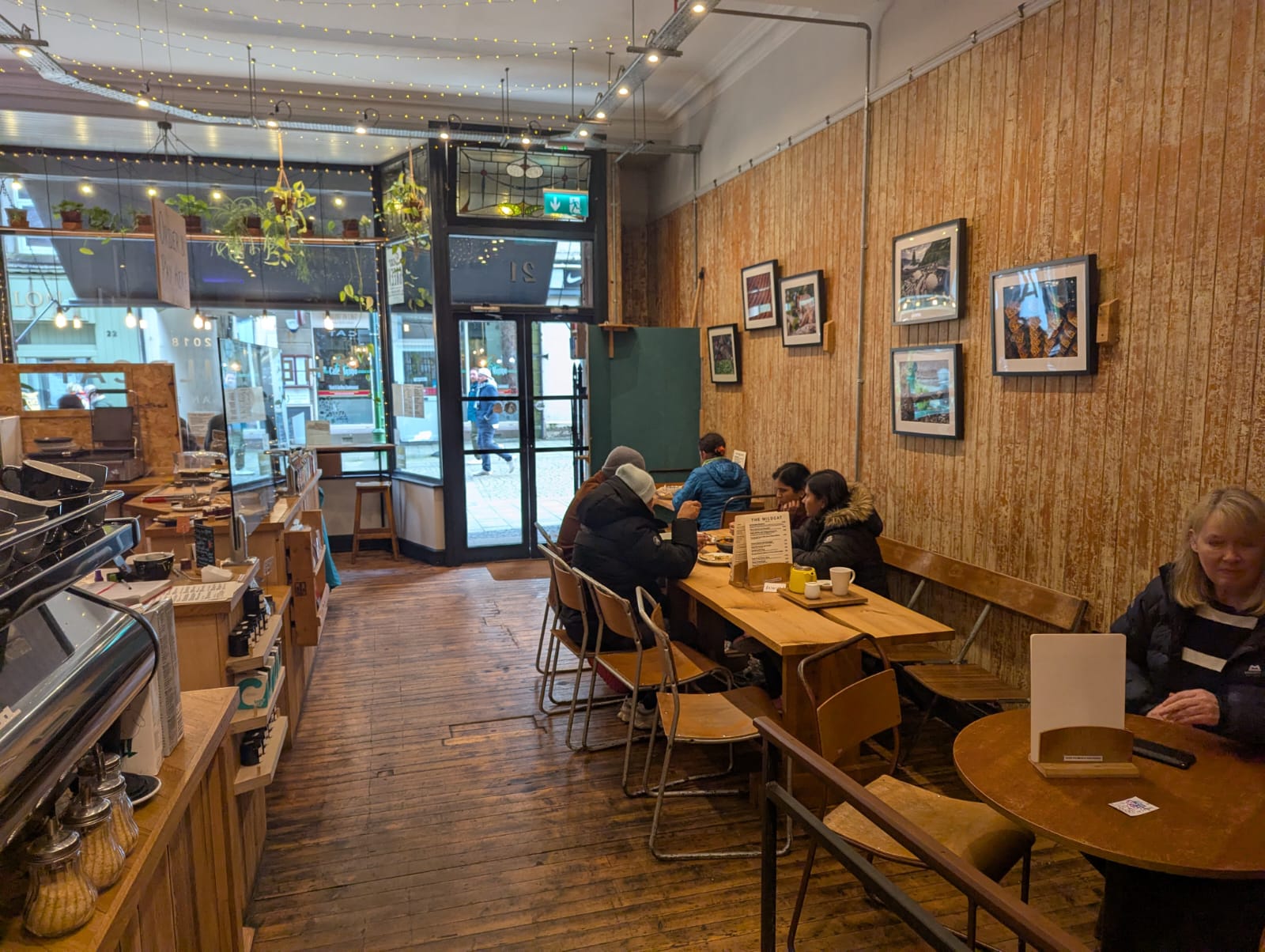 Inside it’s long and rectangular, a high ceiling with old, heavy pews and communal tables. The duct lighting, dark green paint and unforgiving varnished plywood café furniture are all standard for the kind of place your bourgeoisie correspondent always seem to be drinking coffee in. But the real wood floor and panelling make the space welcoming. The Wildcat have attempted to get a classy, old-fashioned café feel and it works.