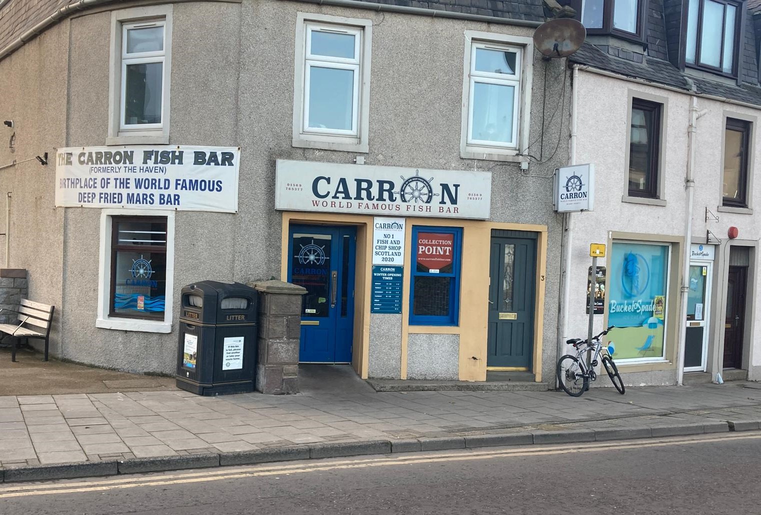 That evening I returned to Stonehaven, you kind of want to. I have a drink in the Marine Hotel, a proper, friendly bar in the old harbour with a pleasingly half-finished décor of old tables, bits of fishing gear and a bare wall covered by a blanket. Then I walk and get a fish supper from the Carron Fish Bar. The Carron claims to be the origin of the deep-fried Mars bar. Which I can’t see on the menu and am too uptight to ask for. The guy is friendly, the fish supper is fine, not spectacular. I eat it in the moonlight on the seafront, safe now the gulls are asleep. The moon is huge over the sea. Moonlight glints off the offshore windfarm array. There is a sole, odd, unmoving high circular cloud in a clear night sky. It’s going to be a fine day tomorrow.