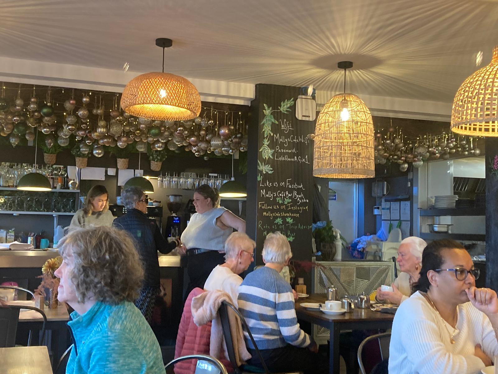 The menu is a bit more brasserie than café; light meals with some interesting twists but I try to stick to the PMiaV budget. A king prawn sandwich comes extremely fast and is excellent. Bloody Mary flavour mayonnaise no less. Well, now I am going to have a pudding with the coffee. These also come with startling speed. Quite good custard tart, the coffee is average to good in a reasonable cup but this doesn’t take away from just how pleasant it is to have lunch in Molly’s. The staff and kitchen efficiency are spectacular. A well-run happy place.
