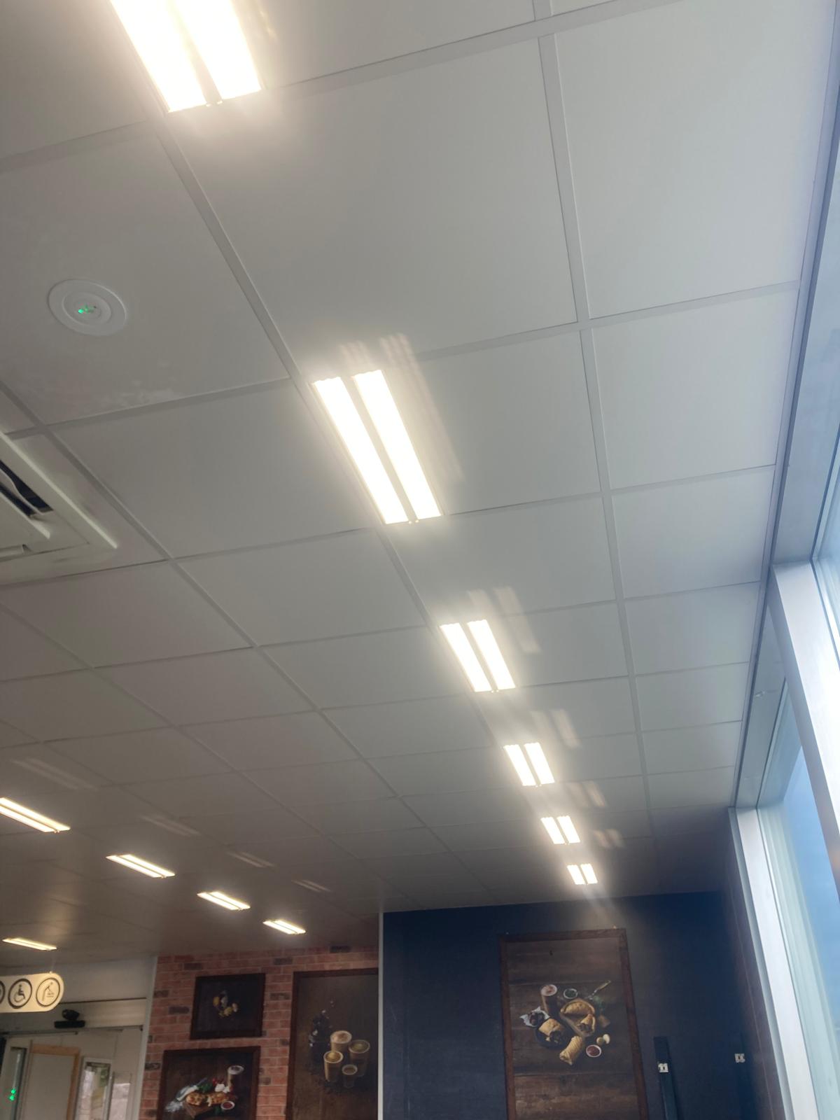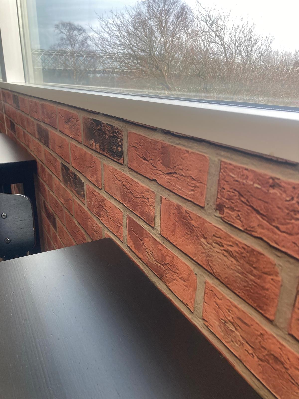 I chose to eat in amongst the hard, black tables and chairs, scarred sofas. The coffee tables bear witness to many work boots and not very clean ones at that. Ersatz brick wall pattern shiny wallpaper and unpleasant fluorescent lighting add to the feel of a space designed by the Home Office or Border Force.