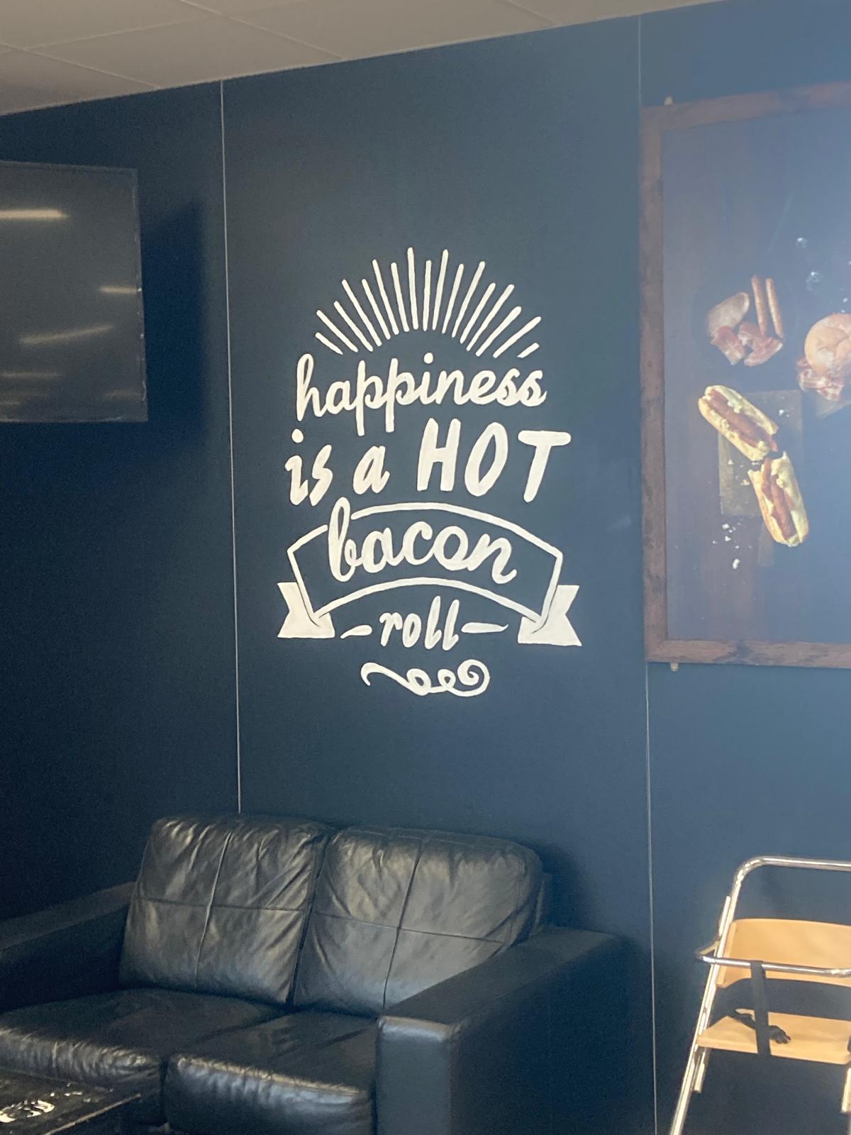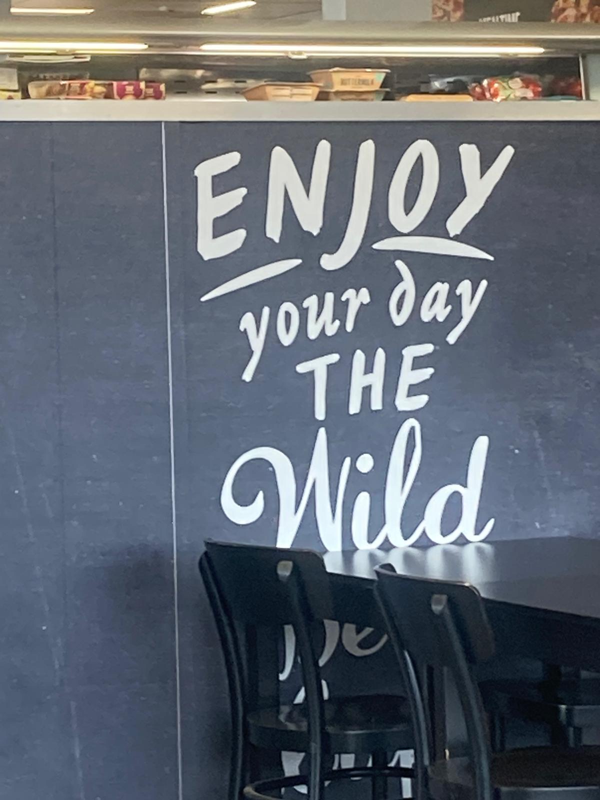 Inside the M&S shop is the WBC. Wild Bean Cafés vary from a standing table in the smaller garages, generally strewn with ripped sugar packets and coffee cup rings, to flagship versions such as Harthill. Which is a large, windswept open area with clear access to the toilets (free, thanks) and dispensers of many condiments in Lilliputian amounts. Radio 2 is inescapable in the background. Chairs and tables are at once uncomfortable but also flimsy, in case one decides to begin a riot with whatever is at hand. Mottos, those maddening aphorisms and nudge theory prompts (*dispersed throughout this piece) from the empty corporate soul of WBC interior design are spaffed up the walls. They feature many random underlinings and varying size matey cursive fonts;