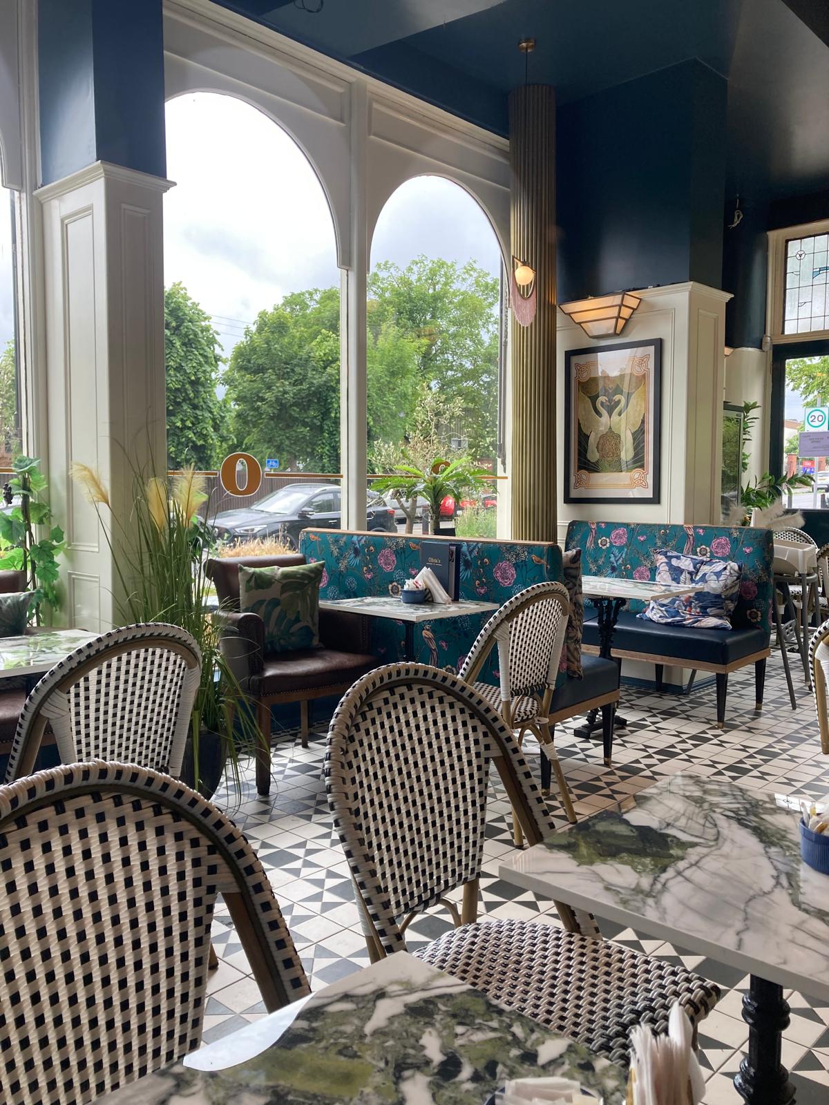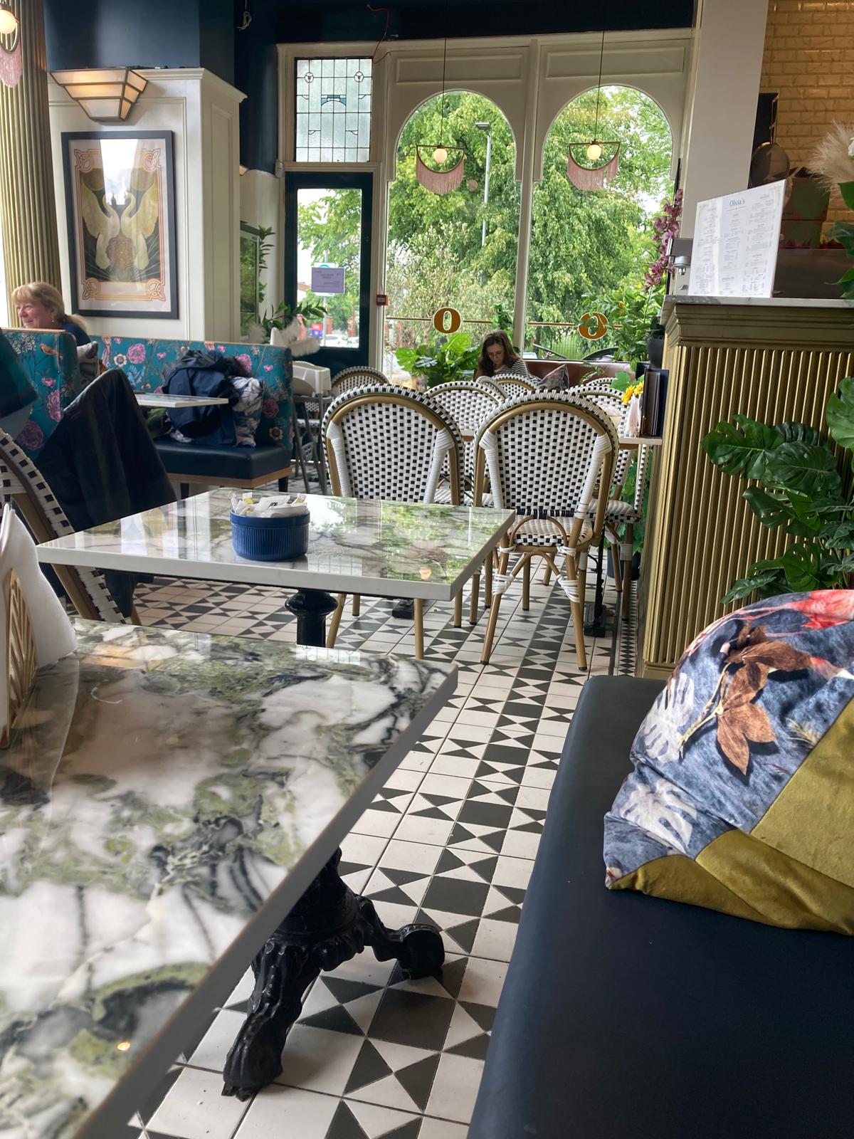 The café interior impresses straight away with its deco-styling theme and myriad well considered touches. A real design effort has made the most of the original features, space and high ceiling and gives Olivia’s a coherent, pleasing interior. One can admire the stylish marble-topped tables, check parquet flooring, B&W chairs, floral bench seats, deco-replica holders, tassled light fittings, gold deco screens and table wear. There is sympathetic 20s style art on the walls. I’m struggling not to say the café is beautifully curated. Too late. Olivia’s is a great space to linger in.