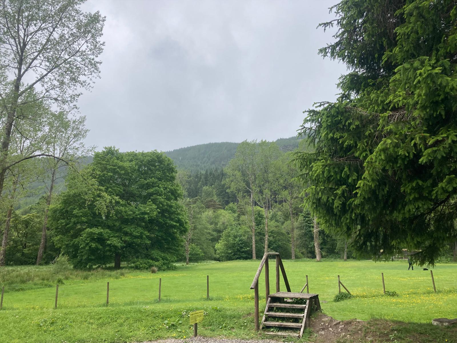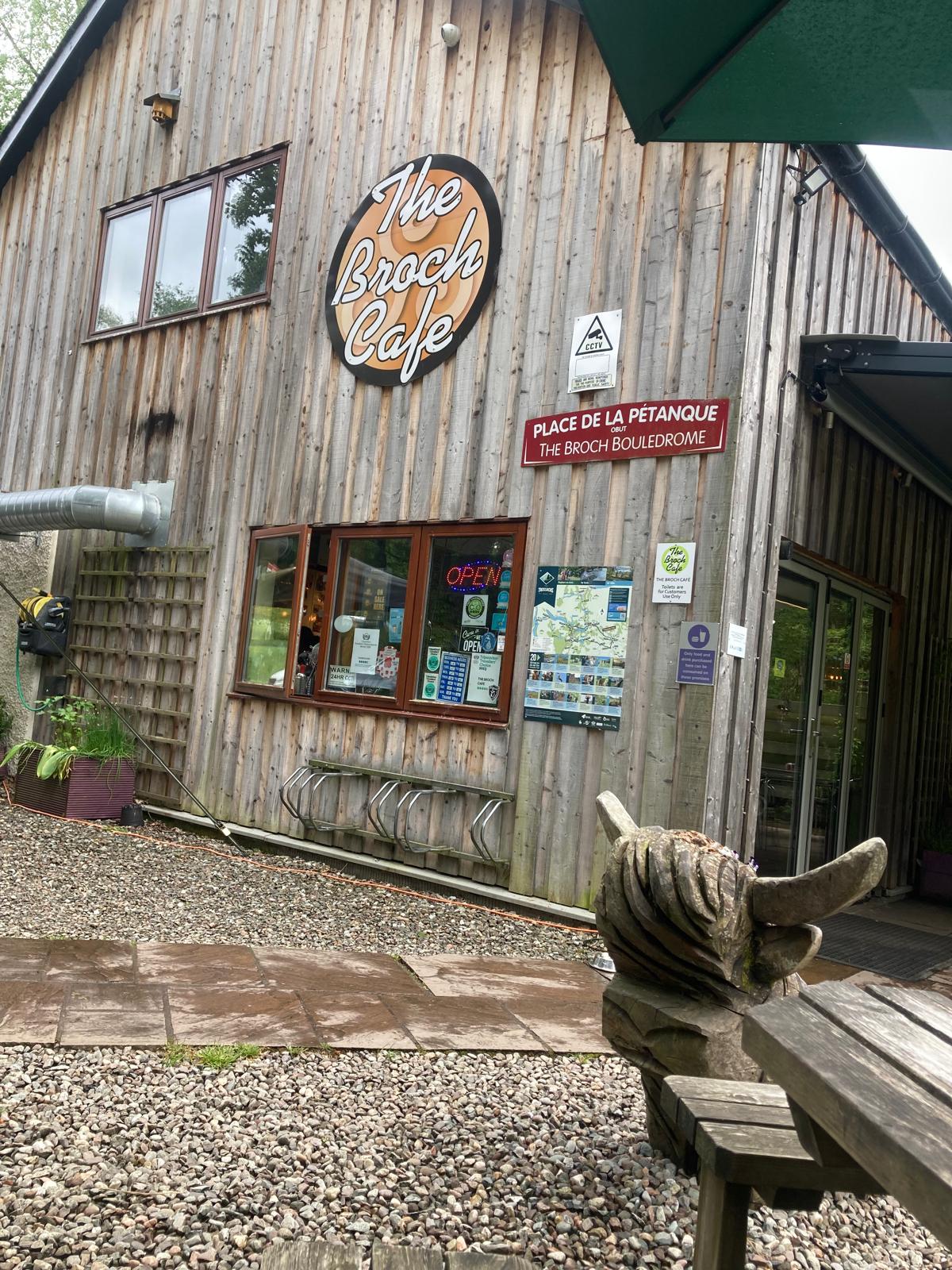 Whilst dallying on the A84, travelling west to east and mentally computing coffee options in Crieff or Callander I felt I should finally give the Broch Café a shake. I have often passed its unprepossessing exterior. It’s an old building extended up to a second storey with utilitarian, weathered pine cladding. There are pleasing views across a meadow and burn up the glen and into the surrounding hills.