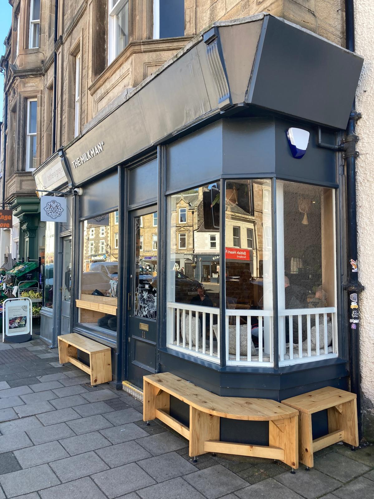 So I did take my customer’s coffee recommendation for the Milkman, Peebles. I parked the trading chariot for free in a meadow-side locale, strolled across a charming suspension bridge over the Tweed, ambled through a green and into the sunny High Street uplands of Peebles. A wise decision.