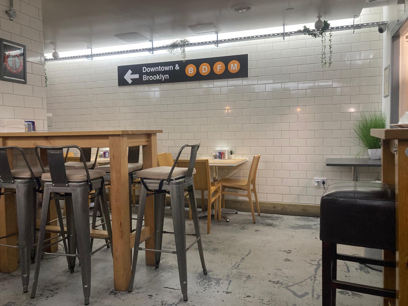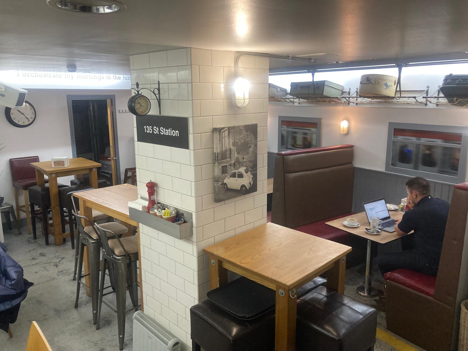 I still hadn’t fully understood the NYC thing despite the name and décor hints upstairs. I went downstairs looking for the loo and the cunning design at last registered with my enfeebled intellect: the entire basement is decked out as an ersatz Subway station. Noo Yawk subway, not Glesga. The 135 St Subway is complete with the correct signage to Downtown or Brooklyn, industrial wall tiles, subway style booths, carriage windows and luggage racks with suitcases. The whole job is Awesome, as one’s Stateside chums do insist on constantly saying, but it really is. So I sat down there and had the breakfast, also excellent.