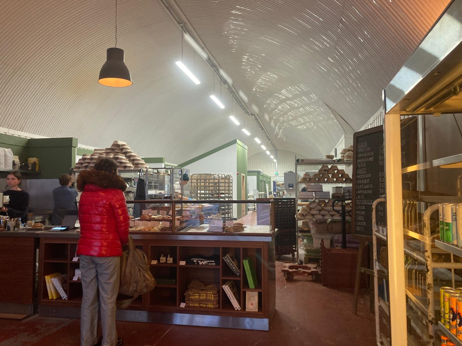 My nose and nosiness had led me to the full-on-supervillain-lair-headquarters of the Cottonrake Bakery. Inside this enormous arch an industrial behemoth lurks, with a huge open area and counter for walk-in customers. The scraped floor still bears the outlines of the previous owner’s carpet showroom racks. Green panelling and a corrugated cream ceiling has been chucked up over most of the old stonework arch but this is unashamedly a factory under the railway lines. Hard tables and benches line the walls to not obstruct the comings and goings of Cottonrake van delivery drivers. But you can sit in a VIP (Very Irritable Posterior) area stage-right, with a cushion on your utilitarian bench if you really must.