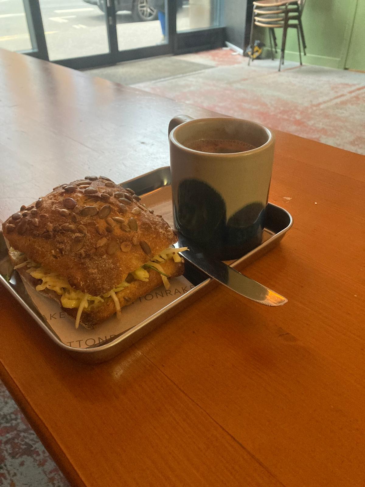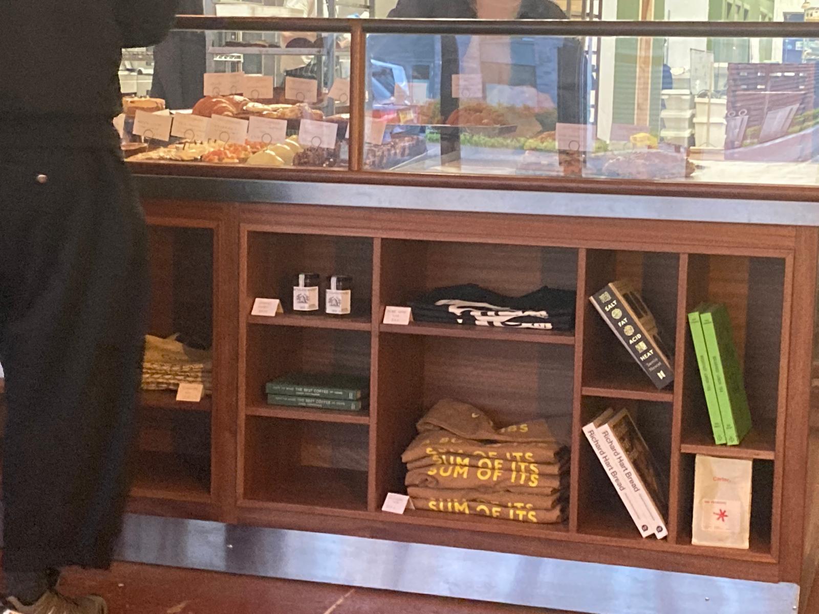 I was going to say the vibe is Industrial, but it’s not a vibe, it just IS Industrial and a pleasure to be in. Behind a counter displaying their generous buns, the charming staff dish out your coffee in a stylish but practical mug and your cake on a metal tray. Cottonrake Commerce St is not a café, it’s a throbbing bread mothership where one can hang around, ogle skilled bakers, eat very fresh baked goods and not have to work. Deeper into the bowels (clean, gleaming infact) of the arch more staff, a delightfully curated assortment of the nice young men and women who make up Scotland in 2026, are labouring away attired in traditional striped blue-and-white bakers’ aprons. They were working hard, so hard that many had been forced to remove their Carhartt beanies.