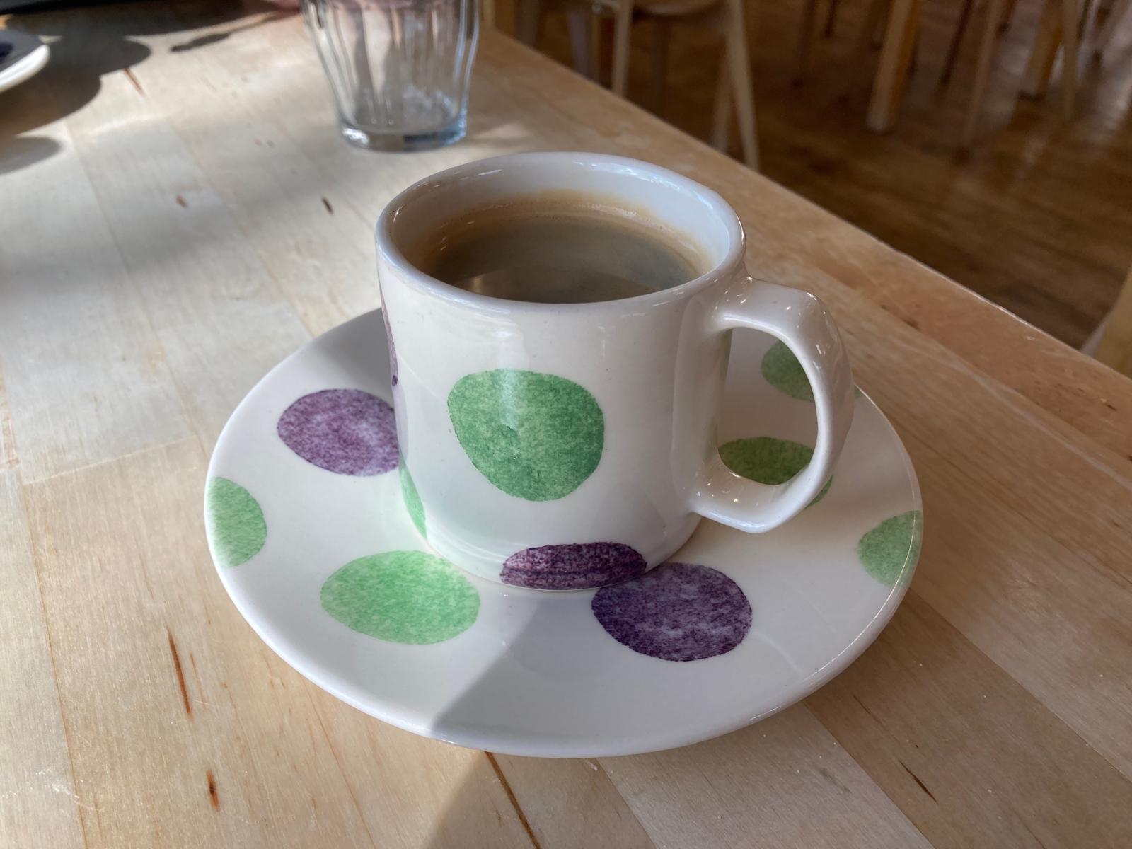 This is a pottery/garden/café behemoth, quite unexpected in a small village. The café is in a huge, high-ceilinged brick and oak extension. All is very pleasant and very efficiently run with a relaxed canteen/National Trust vibe. Two coffees and a fine scone were had for £9.90. The coffee was served in their own rather striking small-mug-and-large-saucer spotted combination. A huge quiche and salads for £15.50 went down well. The coffee was a reasonable but unexceptional dark roast and the quiche could perhaps go more Spanish on the garlic but this place is a pensioner magnet and they clearly know their market. All in all a rather charming place with a fine ethos and good value for money.